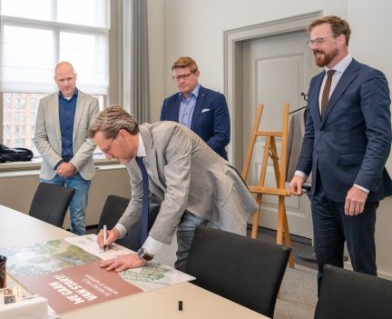 Op de foto van links naar rechts: Floris Droste (Droste Bouwgroep B.V.), Martin Companje (Roosdom Tijhuis en BPD | Bouwfonds Gebiedsontwikkeling), Jordan Lingsma (Plegt-Vos) en wethouder Rik van Niejenhuis.